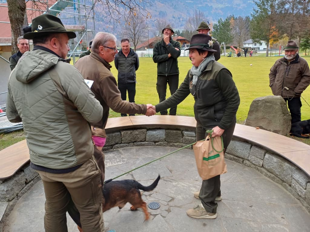 - Ehrenmitglied und Leistungsrichter Peter Mattersberger gratuliert Margreth Rass und Odin vom Nestbichl zur perfekten Leistung auf der künstlichen Schweißfährte – Klub Dachsbracke 2025