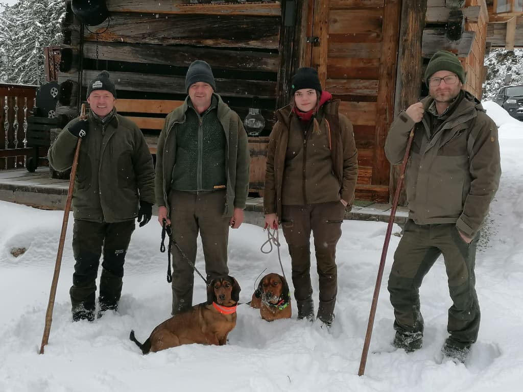 Am 18.12.2025 wurde das erste Hundegespann bei 5 C° und nebeligem, teils schneefreien Wetter geprüft. Es handelte sich um Moritz Weiss mit Fabel The Flachau Paerel. Fabel (Rufnahme: Hubi) wurde nach Anweisung von den Richtern in einem ca. 30- bis 40-jährigen Fichtenbestand, bei milden 5 C°, oberhalb der Nebeldecke, zur Suche geschnallt. Weit ausholend und mit tiefer Nase durchsuchte er eifrig die Umgebung. Nach einiger Zeit hob Hubi durch gezielte Heblaute einen Hasen aus der Sasse. Mit sehr kräftigen Spurlaut, Schlag auf Schlag, brackierte der Rüde 25 Minuten lang, bis er zu seinem Führer zurückkehrte, wo er sich willig anleinen ließ. Auf die Schussabgabe zeigte er keinerlei Angst.